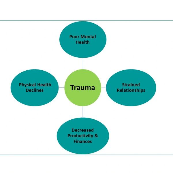 Trauma can significantly impact various aspects of a person’s life and may be the root cause for many of the challenges you are experiencing. Trauma activates the body's stress response, often leading to chronic stress and overwhelm, which dysregulates the nervous system and impairs daily functioning. As shown in the diagram, trauma can manifest as declining physical health. Research connects adverse childhood experiences and chronic trauma to higher rates of heart disease, autoimmune disorders, obesity, and gastrointestinal problems (Felitti et al., 1998). Additionally, trauma affects mental health, contributing to anxiety, depression, PTSD, and substance misuse. It also disrupts interpersonal relationships by fostering hypervigilance, avoidance, or emotional detachment. The consequences spill into professional life, decreasing productivity, increasing absenteeism, and contributing to financial instability. Lastly, trauma can lead to a diminished spiritual connection, resulting in a loss of meaning, purpose, and belonging. Together, these interconnected effects demonstrate the holistic toll of trauma and underscore the importance of trauma-informed recovery approaches that support mind, body, and spirit.